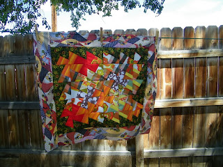 | This is the back side,which I decided to piece. For the top of the quilt I used 20 5x5 charm squares that were in my swap box of fabric,and then some from my stash too. |